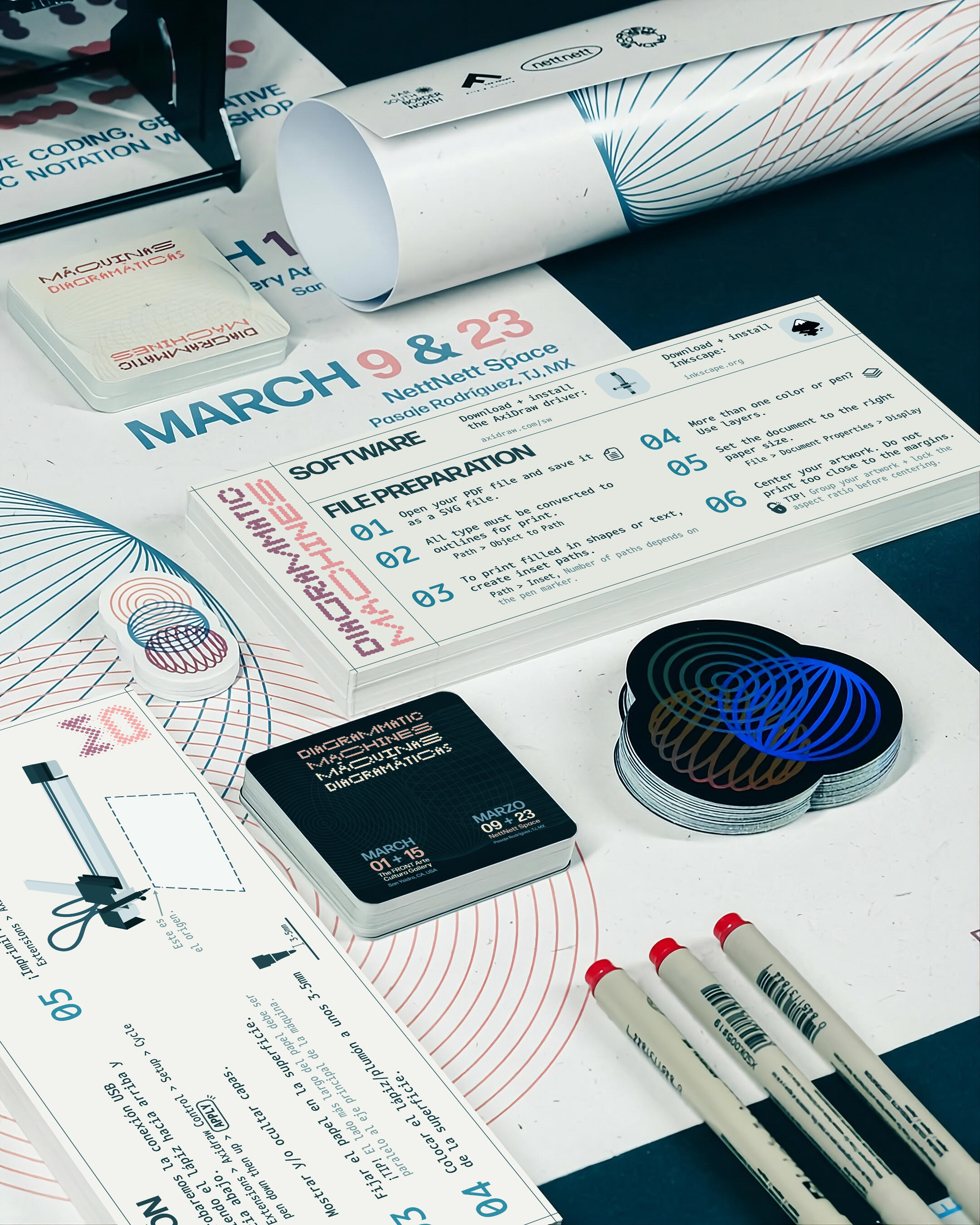 The challenge in branding Juan Manuel Escalante's binational workshop was developing the visual identity with a limited team in under two months, releasing promotional marketing simultaneously. The goal was to make creative coding feel accessible while still prioritizing conceptual depth for more experienced designers.We built a modular brand system that balanced approachability with modernity, translating across language and cultural contexts. The workshop launched in the U.S. and Mexico, attracting participants from both design and non-design backgrounds.Deliverables included a full brand package with print posters, stamped notebooks, bilingual instruction guide, screen-printed tote bags, enamel pins, stickers, social media assets with management, and a dedicated webpage, diagrammatics.net.